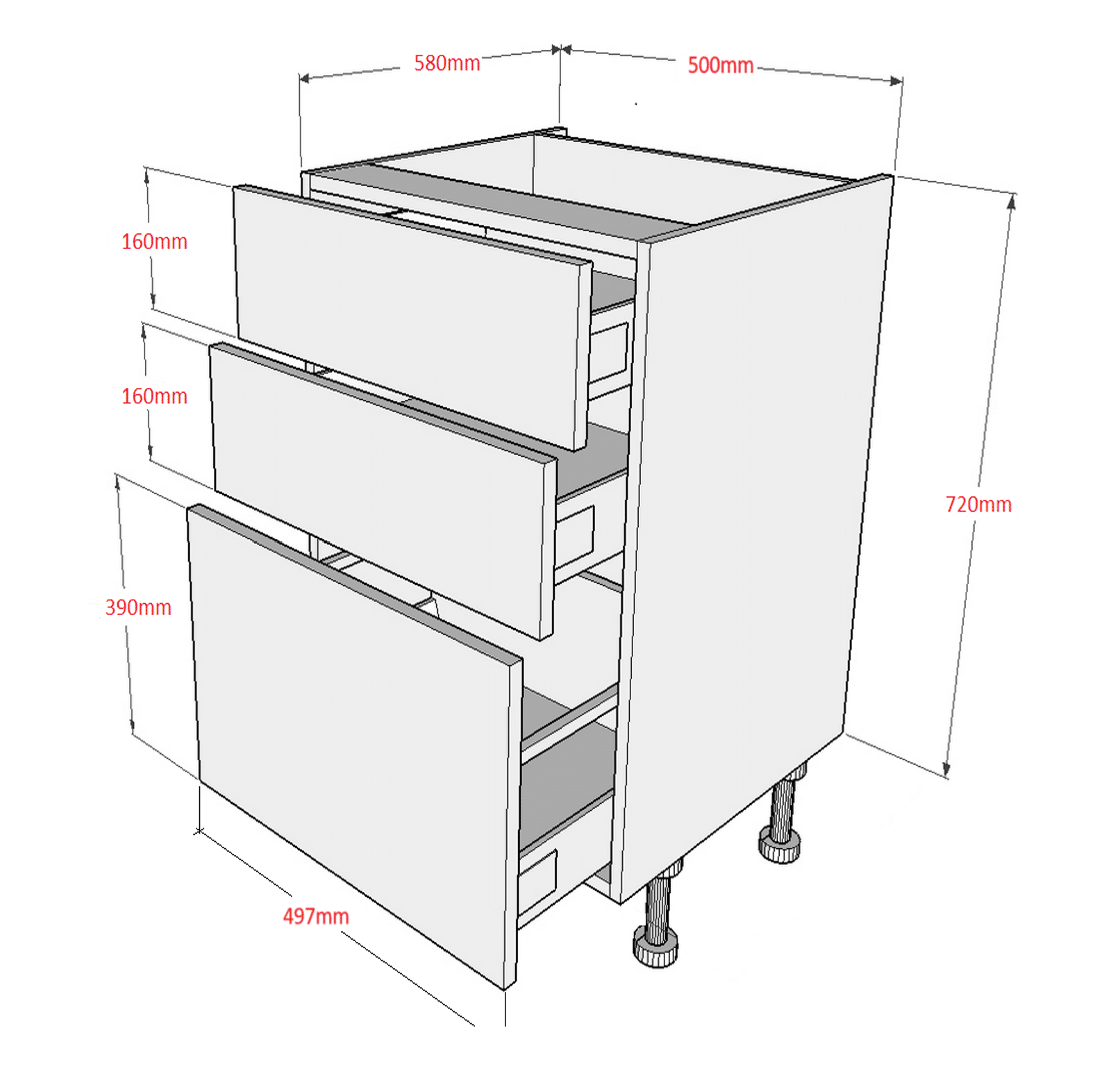 500mm wide 3 Drawer Line Single Base Unit, solid-quality and durable, designed for reliable everyday storage.